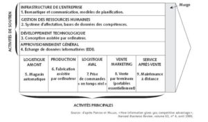 - les activités primaires de la chaine de valeur correspondent à l’acquisition des ressources, à la fabrication, à la distribution et au service après-vente ;
